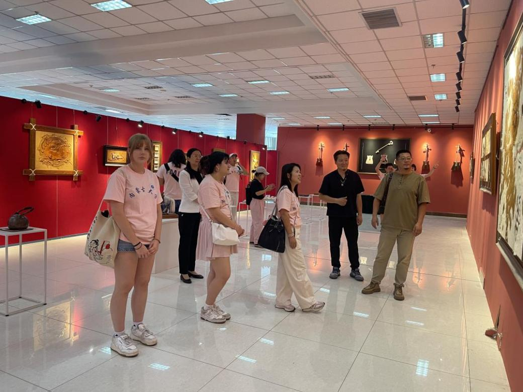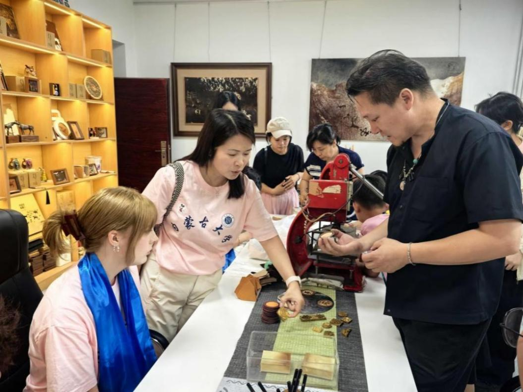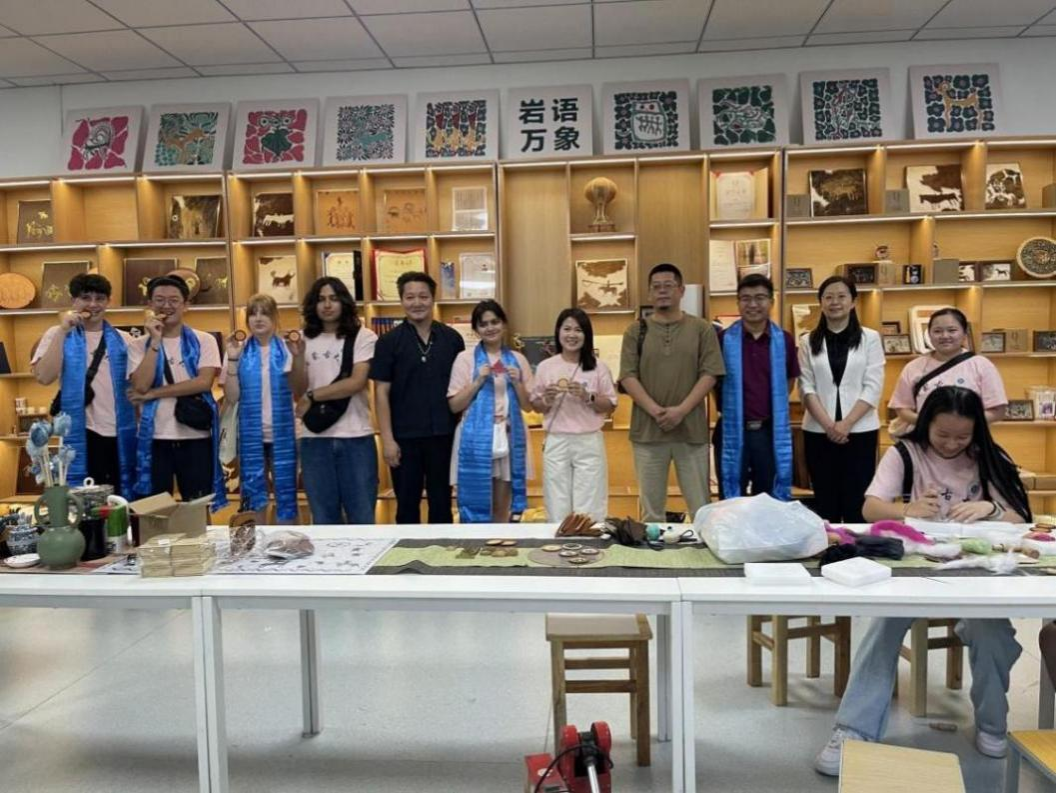 訪問(wèn)團(tuán)師生在美術(shù)與設(shè)計(jì)學(xué)院參觀了非遺美術(shù)作品展,走進(jìn)自治區(qū)級(jí)創(chuàng)新工作室“木仁創(chuàng)新工作室”,學(xué)習(xí)體驗(yàn)了皮畫、毛氈等非遺美術(shù)作品制作,感受到了北疆非遺技藝?yán)锏慕承呐c文化密碼,在創(chuàng)作互動(dòng)中實(shí)現(xiàn)了審美與情感的跨文化共鳴。