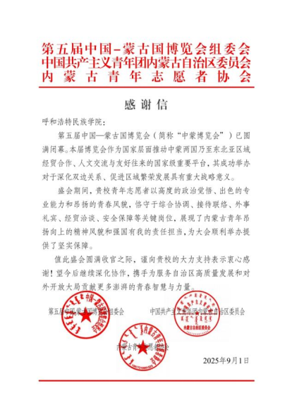 8月25日,第五屆中國(guó)—蒙古國(guó)博覽會(huì)在呼和浩特開(kāi)幕,我校外國(guó)語(yǔ)學(xué)院教師包金蘭、商學(xué)院教師巴達(dá)拉夫在會(huì)議期間擔(dān)任翻譯,來(lái)自多個(gè)專業(yè)的60余名學(xué)生擔(dān)任志愿者,他們以扎實(shí)的專業(yè)能力、飽滿的服務(wù)熱情和嚴(yán)謹(jǐn)?shù)墓ぷ鲬B(tài)度,在多項(xiàng)重要活動(dòng)中承擔(dān)志愿服務(wù)與會(huì)務(wù)支持工作,為推動(dòng)中蒙交流合作貢獻(xiàn)青春力量。第五屆中國(guó)—蒙古國(guó)博覽會(huì)組委會(huì)聯(lián)合共青團(tuán)內(nèi)蒙古自治區(qū)委員會(huì)、內(nèi)蒙古青年志愿者協(xié)會(huì)向我校發(fā)來(lái)感謝信,對(duì)我校青年志愿者在博覽會(huì)期間的突出貢獻(xiàn)予以高度認(rèn)可。