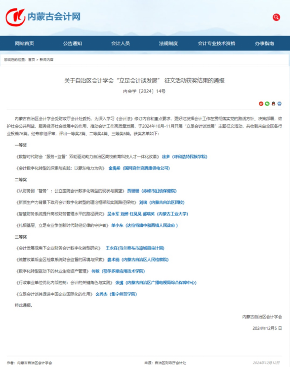 近日,內(nèi)蒙古自治區(qū)會(huì)計(jì)學(xué)會(huì)公布“立足會(huì)計(jì)談發(fā)展”征文活動(dòng)獲獎(jiǎng)結(jié)果,我校財(cái)務(wù)處徐多題為《數(shù)智時(shí)代財(cái)會(huì)“服務(wù)+監(jiān)督”雙輪驅(qū)動(dòng)助力自治區(qū)高校教育科技人才一體化改革》的征文作品獲得一等獎(jiǎng)。