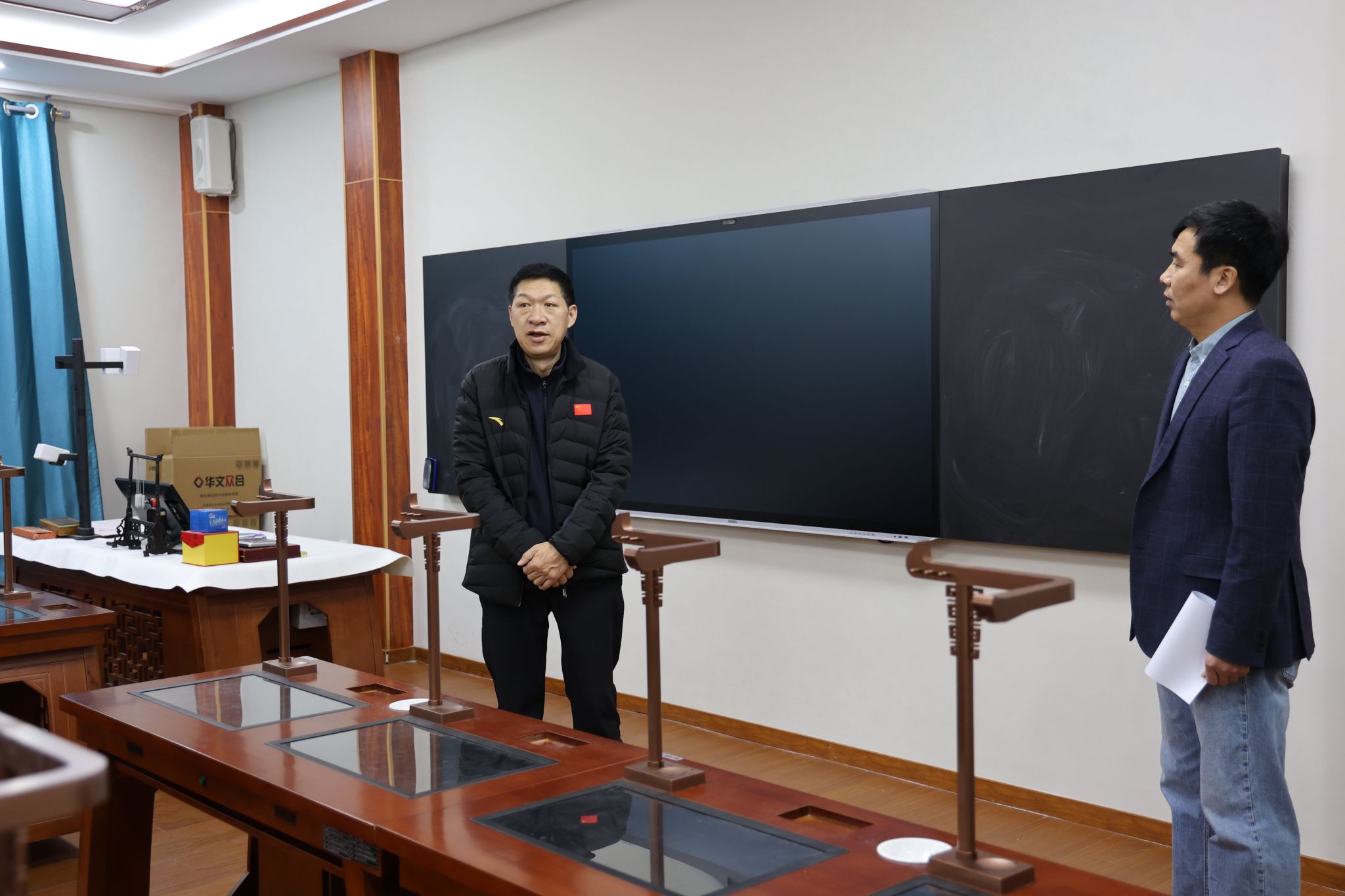劉九萬一行先后走訪了智能書法教室、微課錄制室、微格教室、VR實(shí)訓(xùn)室、教具室、創(chuàng)新創(chuàng)業(yè)孵化基地等實(shí)驗(yàn)實(shí)訓(xùn)場(chǎng)所。每到一處,劉九萬都認(rèn)真聽取相關(guān)部門負(fù)責(zé)人的匯報(bào),詳細(xì)了解實(shí)驗(yàn)實(shí)訓(xùn)設(shè)備的配置、使用效率、維護(hù)保養(yǎng)等情況,仔細(xì)詢問實(shí)驗(yàn)實(shí)訓(xùn)課程的開設(shè)、教學(xué)安排、師資配備以及學(xué)生實(shí)踐操作情況,查看實(shí)驗(yàn)實(shí)訓(xùn)室的環(huán)境布局、安全設(shè)施配備等細(xì)節(jié)。