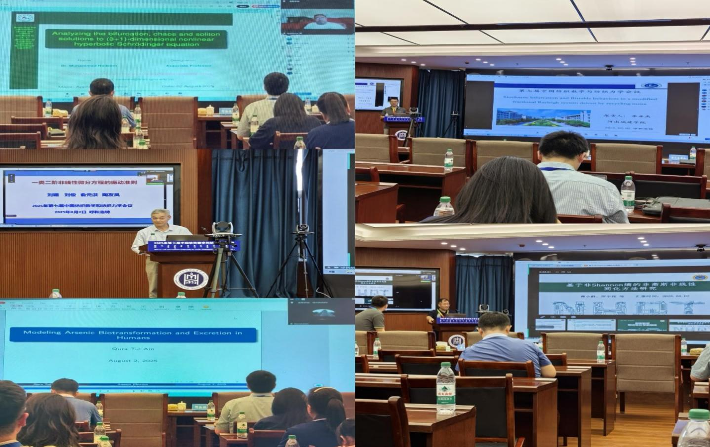 邀請報(bào)告環(huán)節(jié),曲靖師范大學(xué)助理教授Muhammad Nadeem、河南城建學(xué)院李亞杰副教授、曲靖師范學(xué)院劉俊教授、廣州大學(xué)博士后 Q.T.Ain、國防科技大學(xué)曹小群教授分別以“Analyzing the bifurcation, chaos and soliton solutions to (3+1)-dimensional nonlinear hyperbolic Schr?dinger equation”“Stochastic bifurcation and bistable behaviors in a modified fractional Rayleigh system driven by recycling noise ”“Oscillation criteria of a class of second order nonlinear differential equations”“Modeling Arsenic Biotransformation and Excretion in Humans”“基于非Shannon 熵的非高斯非線性同化方法研究”為題作報(bào)告。