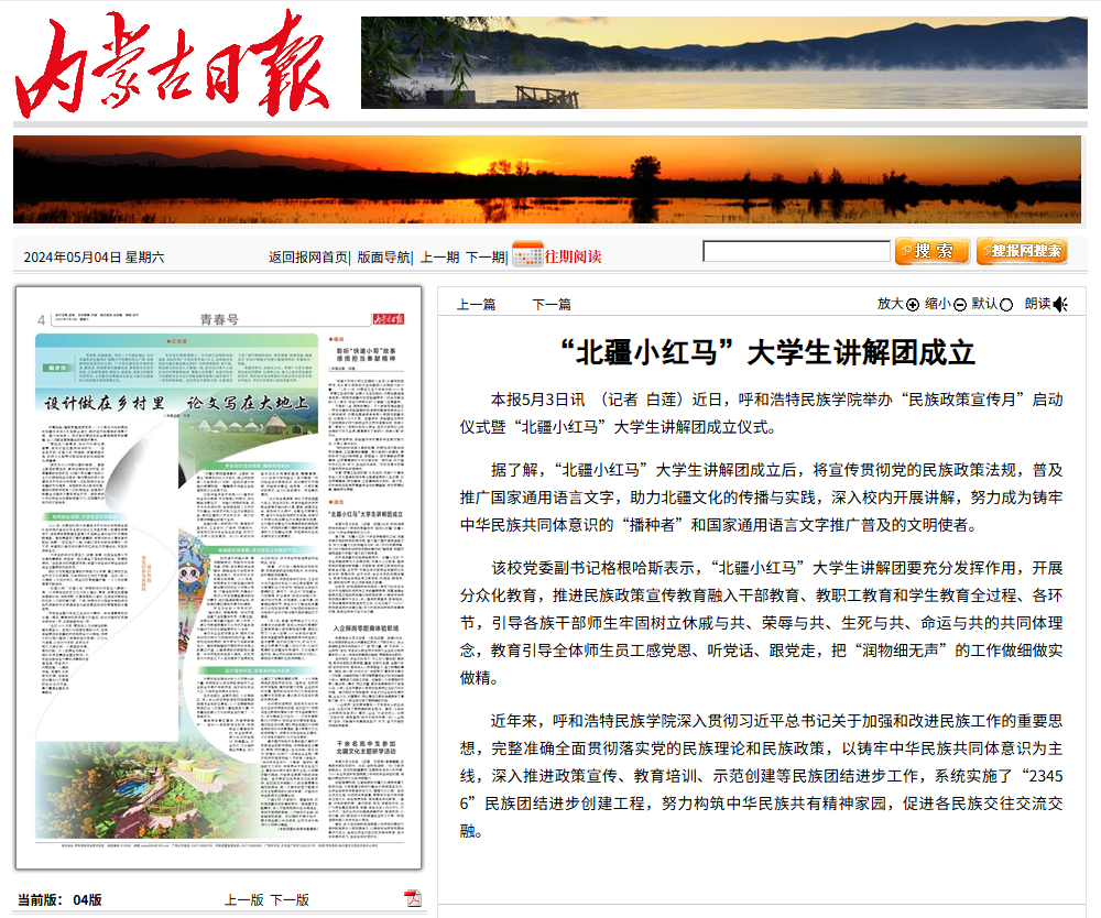 打造品牌團(tuán)隊(duì)。組建“北疆小紅馬”大學(xué)生講解團(tuán),累計(jì)接待兩館兩廊參觀團(tuán)525個(gè),近4萬人次來訪;團(tuán)隊(duì)先后入選2024年全國(guó)大學(xué)生沂蒙精神志愿宣講團(tuán)、呼和浩特市民委“青城融講”鑄牢中華民族共同體意識(shí)講解團(tuán)、新城區(qū)民委鑄牢中華民族共同體意識(shí)宣講團(tuán),多次參與自治區(qū)民委、呼和浩特市民委大型宣講活動(dòng)。講解團(tuán)創(chuàng)新采用“講解+演繹”模式,將民族團(tuán)結(jié)進(jìn)步故事與沂蒙精神帶入中小學(xué)、企業(yè)及鄉(xiāng)村振興幫扶點(diǎn);通過“大手拉小手”培養(yǎng)紅領(lǐng)巾講解員,推動(dòng)思政教育在不同學(xué)段的內(nèi)容銜接與協(xié)同育人。團(tuán)隊(duì)“課本劇里的紅色北疆”創(chuàng)新項(xiàng)目,在學(xué)?!氨苯幕瘎?chuàng)新大賽”中榮獲特等獎(jiǎng),將國(guó)家通用語言文字推廣與思政教育有效融合。
