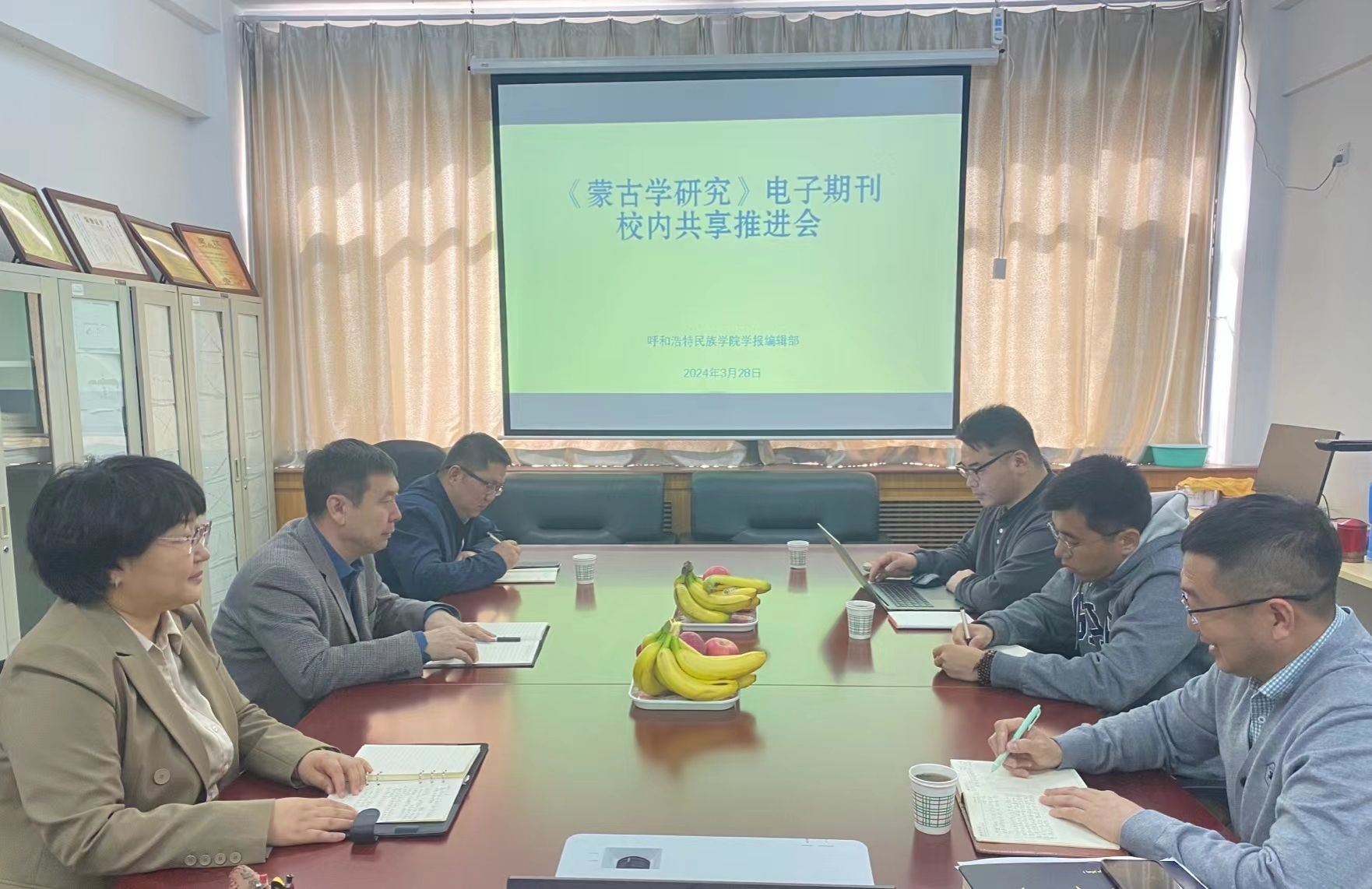 為促進(jìn)學(xué)術(shù)資源的共享與利用,3月28日,學(xué)報編輯部舉行了《蒙古學(xué)研究》電子版校內(nèi)共享推進(jìn)會。學(xué)報編輯部全體人員、信息中心副處長格勒娃以及ONON公司工作人員寶樂爾、阿榮登參加會議。
