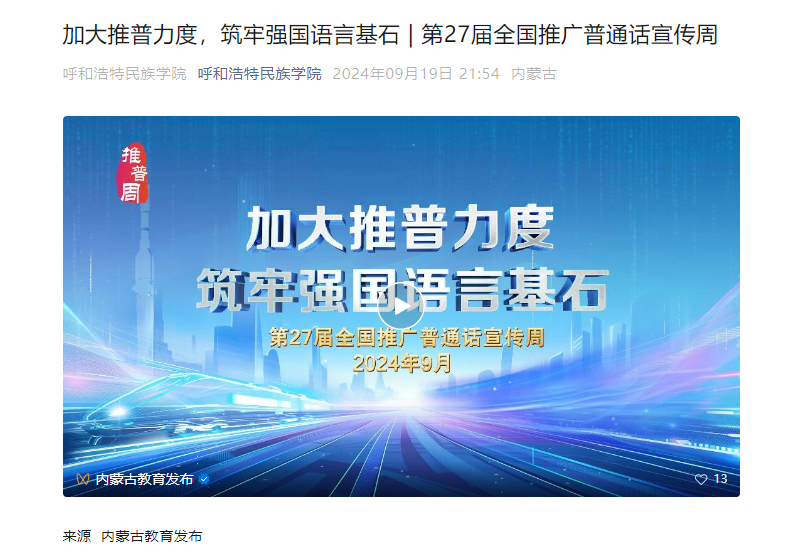 學(xué)校官方公眾號(hào)分別發(fā)布《加大推普力度,筑牢強(qiáng)國(guó)語(yǔ)言基石 | 第27屆全國(guó)推廣普通話(huà)宣傳周內(nèi)蒙古自治區(qū)公益宣傳片來(lái)啦》《加大推普力度 筑牢強(qiáng)國(guó)語(yǔ)言基石——第27屆全國(guó)推廣普通話(huà)宣傳周海報(bào)來(lái)啦》《加大推普力度,筑牢強(qiáng)國(guó)語(yǔ)言基石 | 第27屆全國(guó)推廣普通話(huà)宣傳周》《第27屆全國(guó)推廣普通話(huà)宣傳周重點(diǎn)活動(dòng)在新疆喀什舉辦》等推文在師生中進(jìn)行廣泛宣傳。教學(xué)樓、宿舍樓等11塊思政教育電子屏上投放第27屆推普周宣傳海報(bào)進(jìn)行滾動(dòng)宣傳播放。各學(xué)院也結(jié)合專(zhuān)業(yè)特色印制海報(bào)、懸掛條幅,共同營(yíng)造了濃厚的推普學(xué)習(xí)活動(dòng)氛圍。