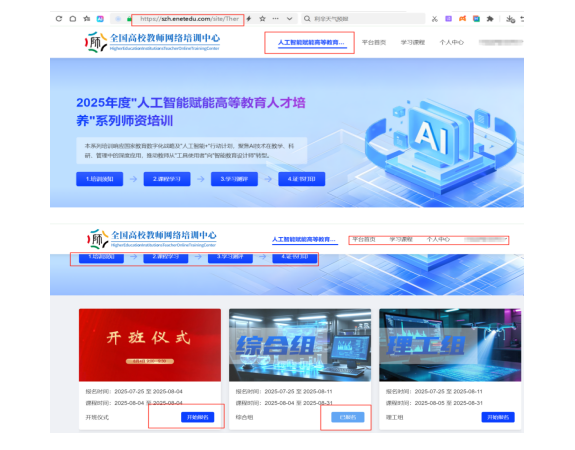 參加線上理論培訓的人員于2025年8月8日前登錄直播平臺(https://szh.enetedu.com)“人工智能賦能高等教育人才培養(yǎng)系列師資培訓”專區(qū),輸入手機號與驗證碼報名,查看具體培訓日程安排及注意事項,并按時參加培訓。