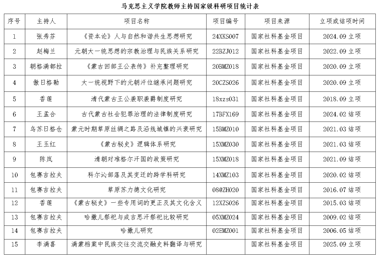 目前,學(xué)院擁有一批學(xué)位、年齡、職稱(chēng)合理的優(yōu)秀教師團(tuán)隊(duì)。教職員工33人,其中教授6人,占比18.2%;副教授6人,占比18.2%;博士11人,占比33.4%;碩士20人,占比63.6% ,高層次人才儲(chǔ)備充足;碩士生導(dǎo)師4人、校外兼職博士生導(dǎo)師1人、碩士生導(dǎo)師8人,特聘教授2人,銀齡教師1人,為人才培養(yǎng)注入多元智慧。團(tuán)隊(duì)中涌現(xiàn)出一批國(guó)家級(jí)、省部級(jí)優(yōu)秀人才:榮獲全國(guó)優(yōu)秀社科普及專(zhuān)家、享受?chē)?guó)務(wù)院政府特殊津貼專(zhuān)家、自治區(qū)“草原英才”、自治區(qū)有突出貢獻(xiàn)的中青年專(zhuān)家、內(nèi)蒙古青年“五四獎(jiǎng)?wù)隆?、入選自治區(qū)意識(shí)形態(tài)領(lǐng)域“四個(gè)一批”人才、自治區(qū)新世紀(jì)“321人才工程”一層次人才、自治區(qū)高等教育“111工程”二層次人員1人;入選自治區(qū)草原英才創(chuàng)新創(chuàng)業(yè)人才、科技英才1人,自治區(qū)高校優(yōu)秀思想政治理論課教師2人、自治區(qū)高校最美思政課教師、“盡職圓夢(mèng)踐行者”—北疆最美教師1人,自治區(qū)高校優(yōu)秀輔導(dǎo)員1人,自治區(qū)高校黨課名師1人,自治區(qū)高校鑄牢中華民族共同體意識(shí)課程“示范性種子”教師2人,近五年獲得全區(qū)高校思政課程和課程思政教學(xué)技能大賽二等獎(jiǎng)1人,獲得自治區(qū)高等院校青年教師技能大賽二等獎(jiǎng)2人,自治區(qū)本科高校教師教學(xué)創(chuàng)新大賽中獲得一等獎(jiǎng)1人。學(xué)院始終堅(jiān)持“以教促研,以研促教”的原則,不斷推動(dòng)教學(xué)科研發(fā)展。專(zhuān)任教師中主持國(guó)家社科項(xiàng)目13項(xiàng),教育部一般項(xiàng)目3項(xiàng),國(guó)家民委項(xiàng)目3項(xiàng),省部級(jí)重點(diǎn)項(xiàng)目4項(xiàng),一般項(xiàng)目40余項(xiàng),出版專(zhuān)著9部,主編教材5部。獲自治區(qū)哲學(xué)社會(huì)科學(xué)優(yōu)秀成果二等獎(jiǎng)3項(xiàng),三等獎(jiǎng)1項(xiàng),建設(shè)自治區(qū)級(jí)一流課程1門(mén)、自治區(qū)在線課程1門(mén)、校級(jí)在線課程2門(mén)、省部級(jí)科研創(chuàng)新團(tuán)隊(duì)1個(gè)、校級(jí)科研創(chuàng)新團(tuán)隊(duì)3個(gè),校級(jí)教學(xué)創(chuàng)新團(tuán)隊(duì)2個(gè)。